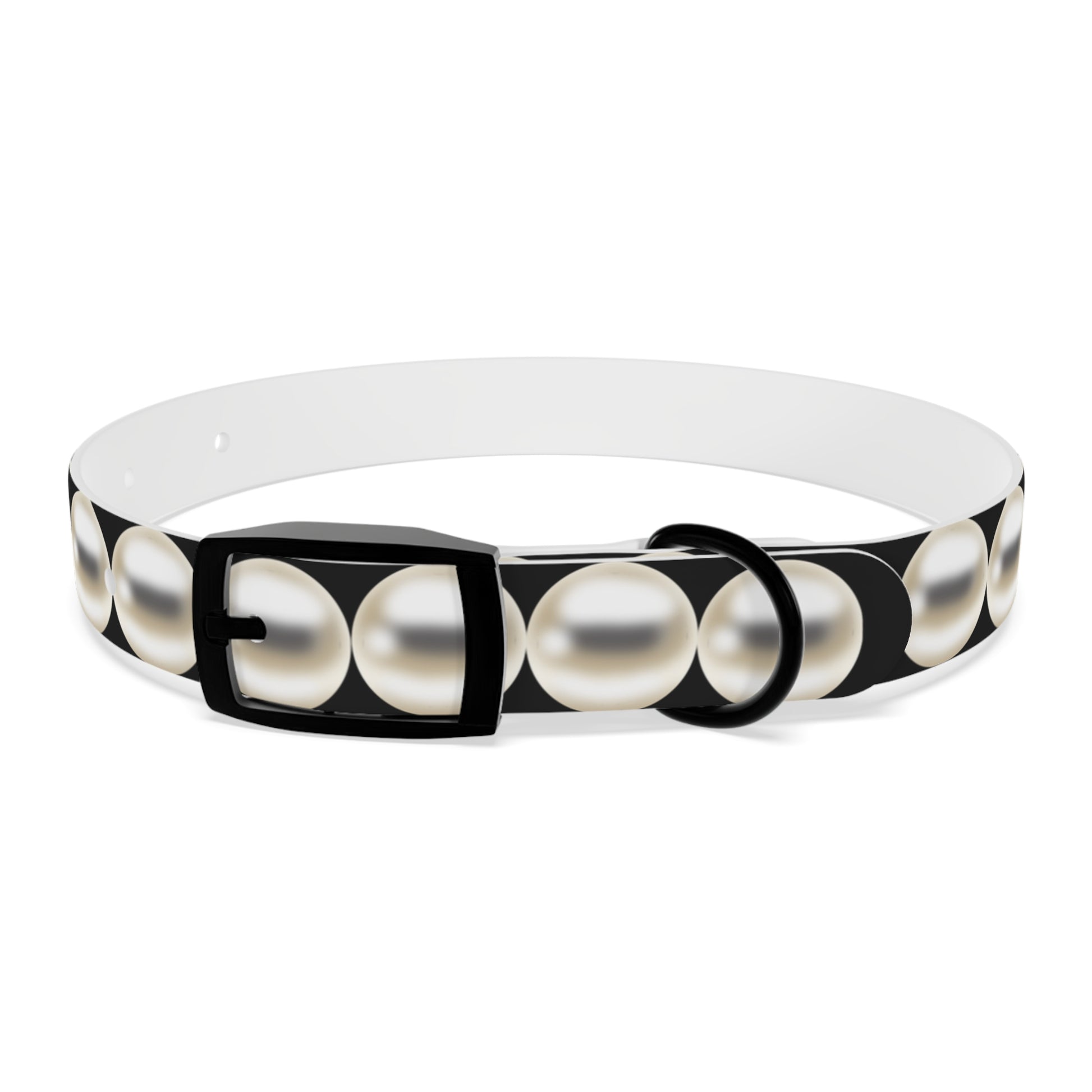 This black dog collar features a delicate white pearl print design, giving the illusion of a classic pearl necklace—stylish, simple, and sophisticated. Whether you're heading to the beach or a formal gathering, this collar adds a touch of charm to any occasion.